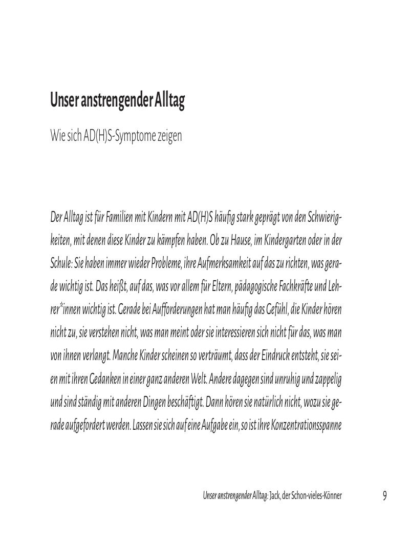 Zusammen mit Jack erleben die Leser in acht Kapiteln viele typische Situationen und Schwierigkeiten, die Familien, pädagogische Fachkräfte und Lehrer*innen aus ihrem Alltag mit Kindern mit AD(H)S gut kennen. Für die Erwachsenen geht jeder Geschichte ein einleitender Text voraus, in dem die jeweilige Konfliktsituation und mögliche Lösungsvorschläge vorgestellt werden.