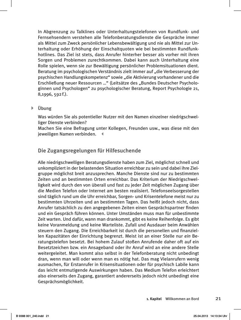 Ob das Vorhaben, weitere Praxisfelder niedrigschwelliger Kontakte zu integrieren, konsequent umgesetzt wird, sei dem Leser/der Leserin überlassen, da sich die Beispiele überwiegend auf Telefonberatungen beziehen. Die Anwendbarkeit und Übertragung auf verwandte Praxisfelder steht dennoch außer Frage.